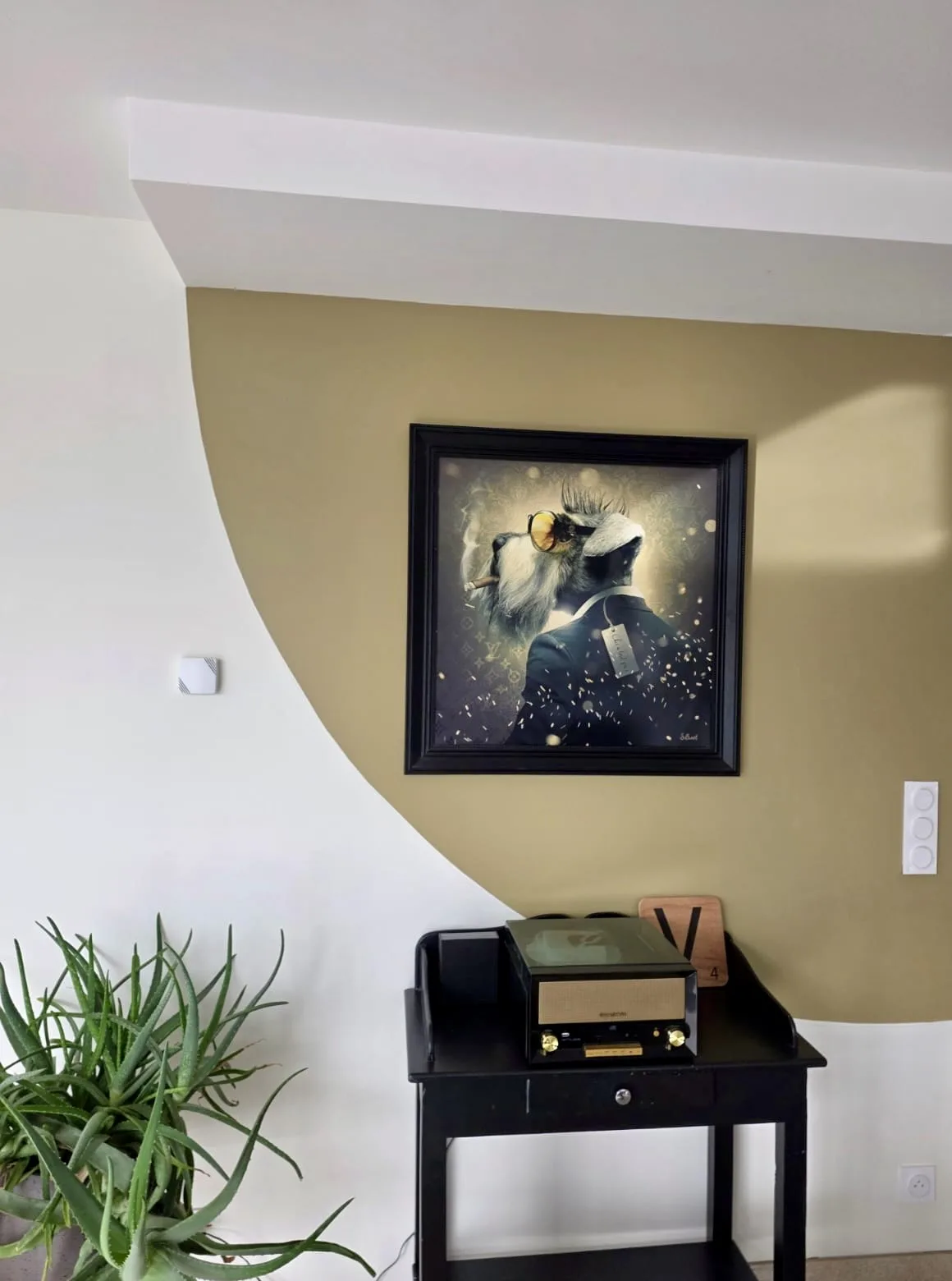Dans cette réalisation, nos équipes ont apporté une touche décorative unique à une pièce à vivre en créant un **quart de rond coloré** contrastant avec le mur blanc.
